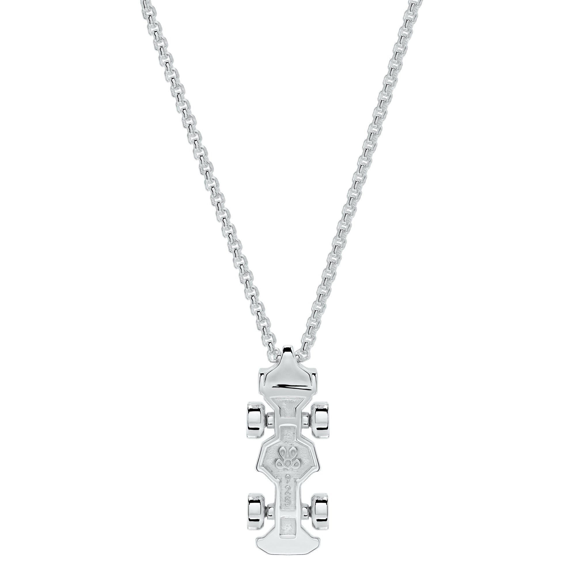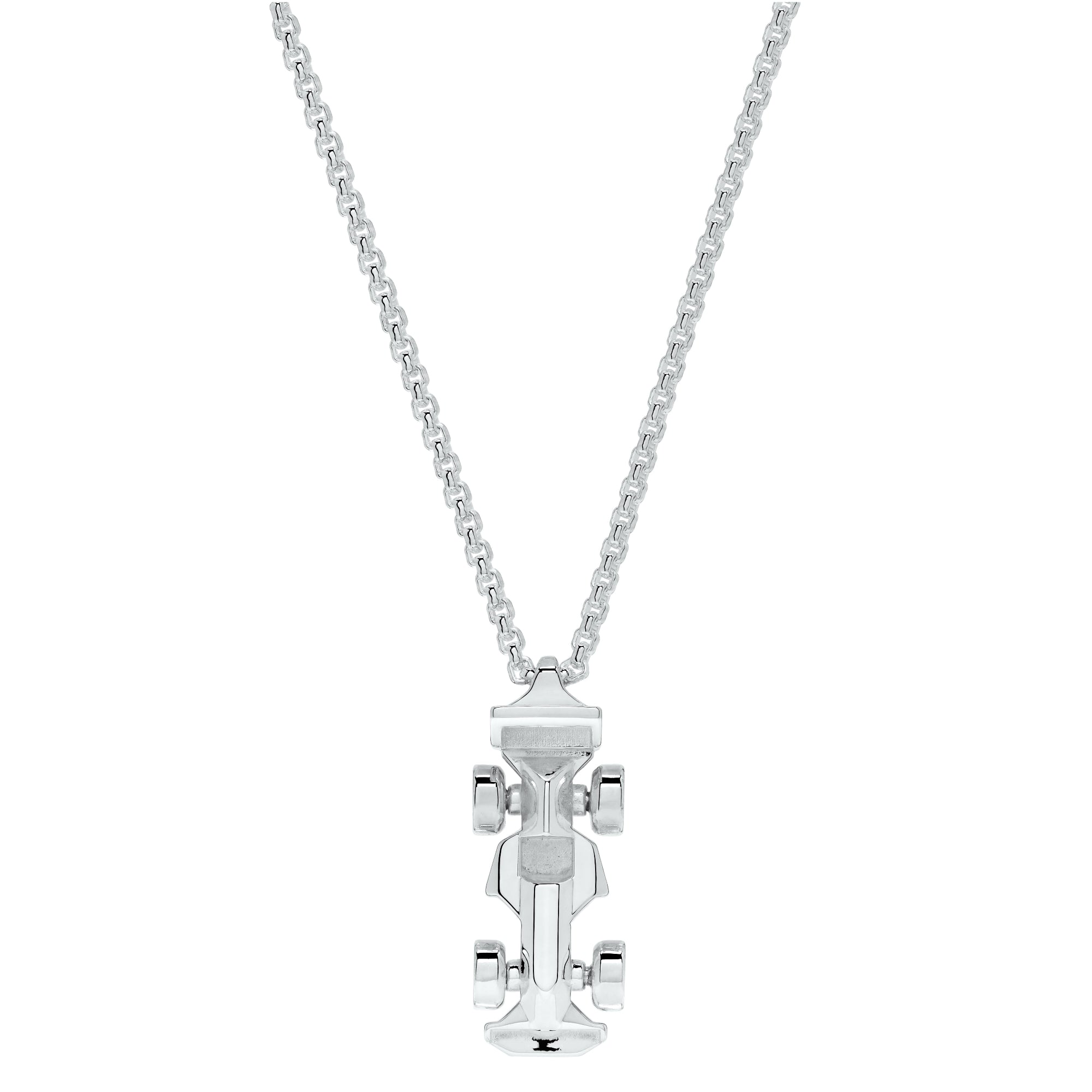 - Design And Features: The Grand - Prix necklace is sculpted as a precise geometric interpretation of a Formula 1 race car, distilling speed and engineering into a wearable form. The underside is embossed in 3D with our logo and 925 sterling silver hallmarks, adding a considered signature detail visible only to the wearer. A fully realized wet-tire Formula 1 tread profile forms the ring/ loop side of the toggle clasp, paired with a vintage Formula 1 wrench as the bar/ T-bar of the closure that both lock together with tension — a mechanical detail that nods to Formula 1 heritage. The wheels are engineered to fully rotate, introducing subtle movement, while the car itself moves freely along the chain, creating a dynamic, kinetic presence when worn. This piece captures motion, precision, and performance in 925 sterling silver.