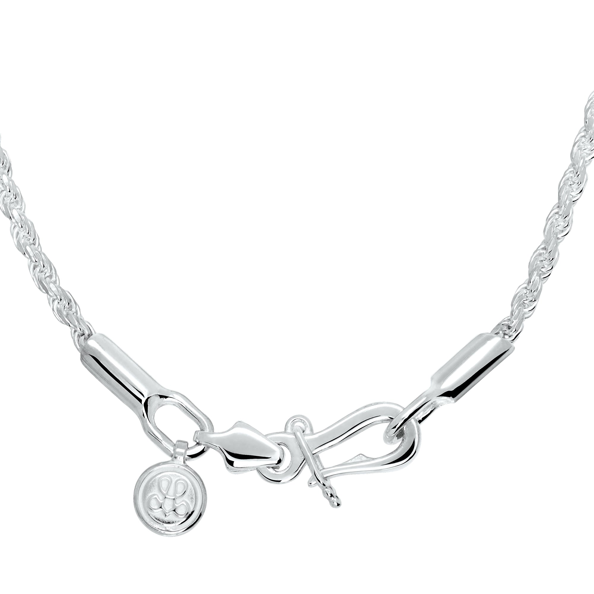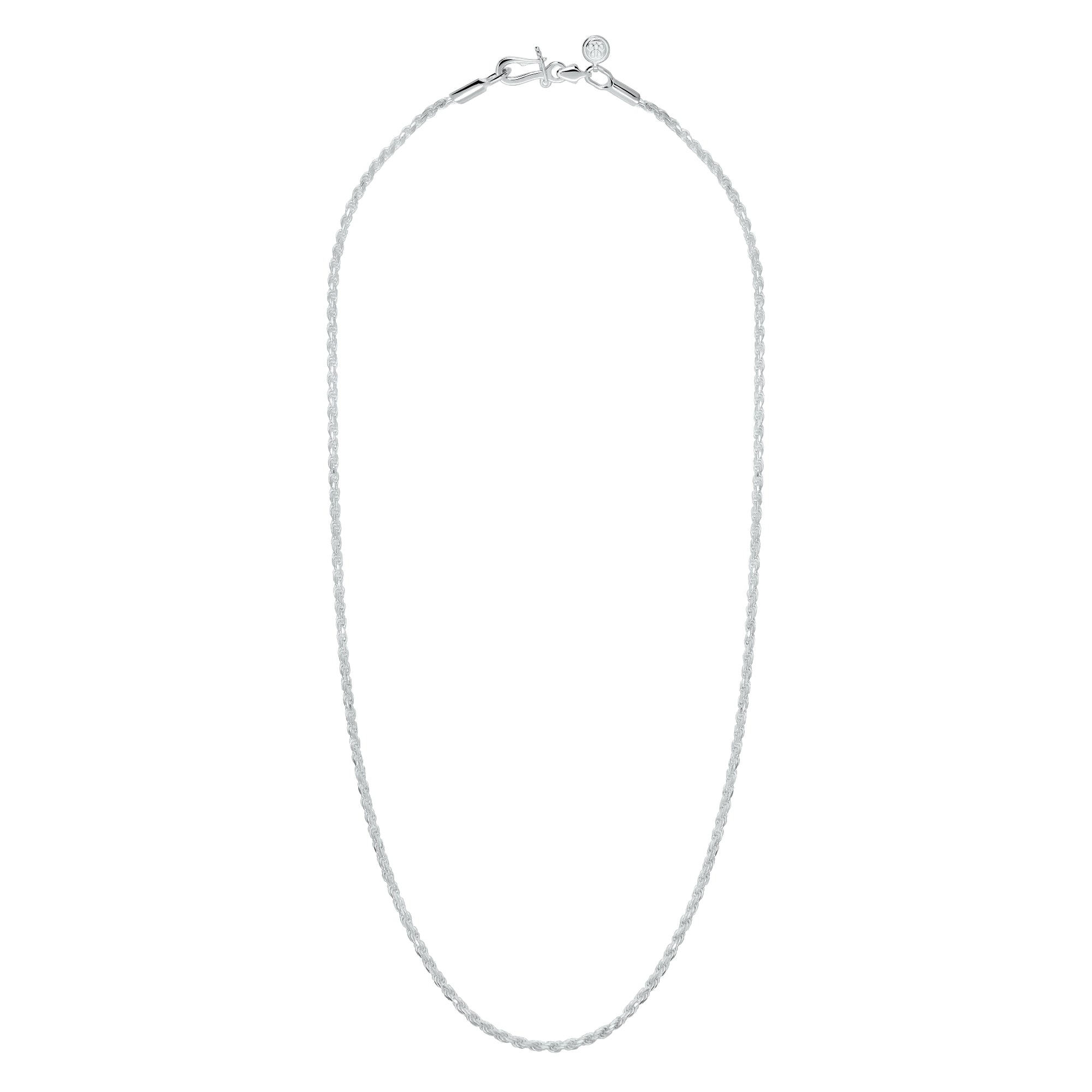 Diamond-cut rope chain end caps are intentionally asymmetrical, doubling as the functional ring that receives the hook and the anchoring point that closes the necklace. A signature tag, embossed in 3D with our logo and stamped with the 925 sterling silver hallmark, completes the piece. A utilitarian classic—built to hold, designed to move.